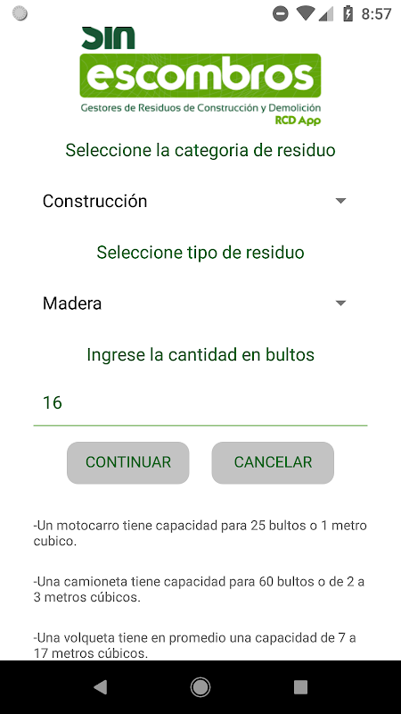 Sin escombros App es una herramienta que conecta generadores de residuos de construcción y demolición RCD, tanto grandes como pequeños, con sus gestores u operadores. Al realizar una reforma en tu hogar o una gran construcción en tu ciudad generas residuos, la App te quiere facilitar el trabajo de disposición al darte la solución de la correcta disposición de acuerdo con la normativa nacional al alcance de tus manos.