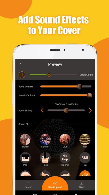 Sing along to the lyrics, add special sound effects to your recording like Pop, Rock, Hip Pop, R&B, Electronic, Phonograph and Jazz Bright, adjust your vocal volume and karaoke volume as well as vocal timing.