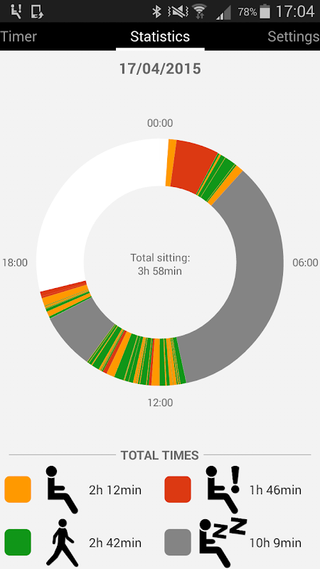The app also shows your sitting statistics of the day in a 24-hour clock chart.