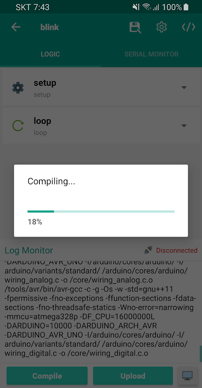 The project created using block programming language form can be compiled and uploaded to Arduino by connecting Arduino directly to smartphone.