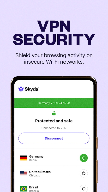 - جب آپ Skyda استعمال کرتے ہیں، تو آپ کا ڈیٹا ہمارے محفوظ اور خفیہ کردہ VPN سرورز سے گزرتا ہے، آپ کا IP ایڈریس تبدیل ہوتا ہے اور اس بات کو یقینی بناتا ہے کہ فریق ثالث اسے روک نہ سکیں۔ آپ کی براؤزنگ سرگرمی اور ذاتی معلومات کو ہیکرز، مشتہرین اور ISPs سے نجی رکھا جاتا ہے۔