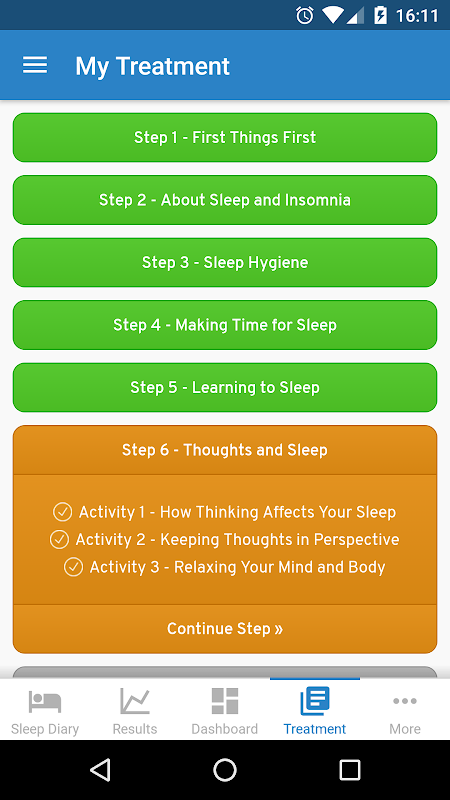 ایپ میں وضاحتی ویڈیوز ، ایک ڈیجیٹل نیند کی ڈائری ، آپ کی پیشرفت پر مستقل رائے ، الارم اور دن کے وقت کا اشارہ ، ایم پی 3 ریکارڈنگ کے ساتھ گہری نرمی کا طریقہ کار ، اور نیند اور بے خوابی سے واقعی مفید معلومات کے کاٹنے کے سائز کے حصے شامل ہیں۔