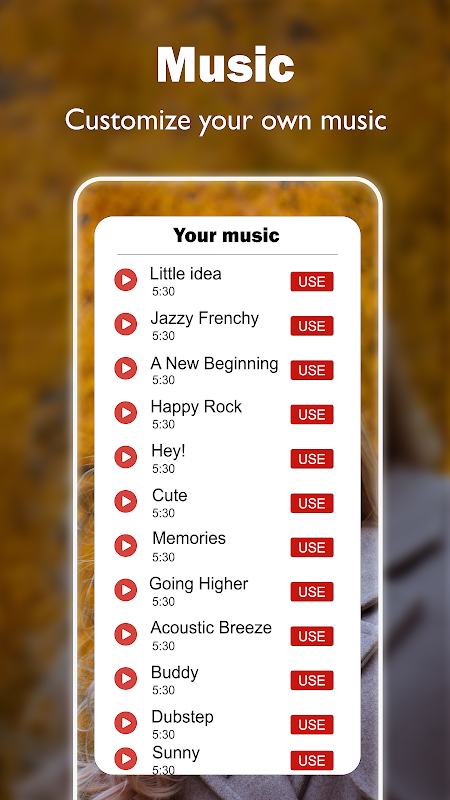 - Add music to the Video Maker, easily select the music you love to add to the video.