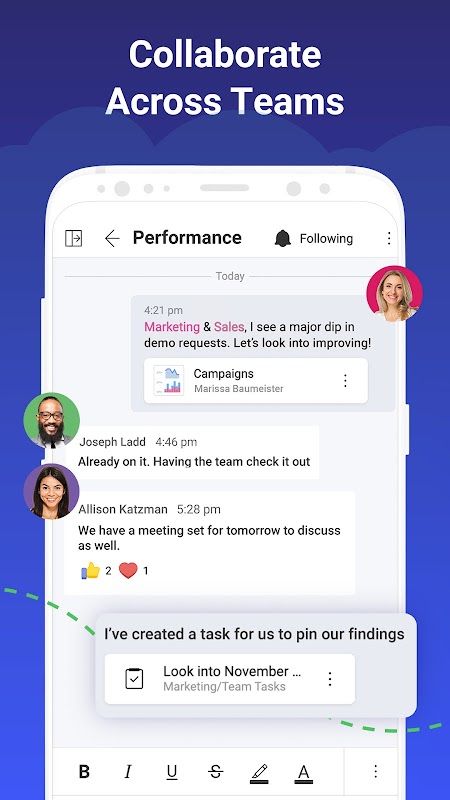 Slingshot کے اندر، آپ کو بہترین نتائج کے لیے بلاتعطل ورک فلو اور ٹیم کا تعاون ملتا ہے۔ چیٹ کی فعالیت کے ساتھ جو کسی ٹاسک اور پروجیکٹ کی سطحوں، گروپ چیٹ، اور 1-1 کے تناظر میں چلتی ہے، اس لیے کوئی خیال، تاثرات، یا بات چیت کبھی ضائع نہیں ہوتی ہے۔ یہ اشتراکی سافٹ ویئر کمیونیکیشن کو بالکل نئی سطح پر لاتا ہے، جس سے تاثرات فراہم کرنا، اپنی ٹیم کے ساتھ چیک ان کرنا اور کسی بھی پیغام کو ایک کلک کے ساتھ کام میں تبدیل کرنا آسان ہو جاتا ہے۔