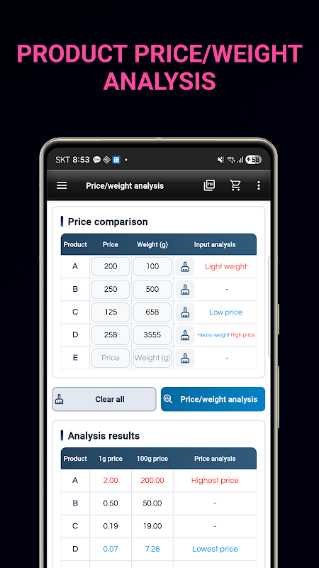 قیمت/وزن کا تجزیہ: فی 1 گرام اور 100 گرام قیمتوں کا موازنہ کریں۔