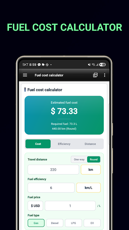 ایندھن کی کارکردگی/گیس لاگت کیلکولیٹر: ایندھن کی کارکردگی اور گیس کے اخراجات کا حساب لگائیں