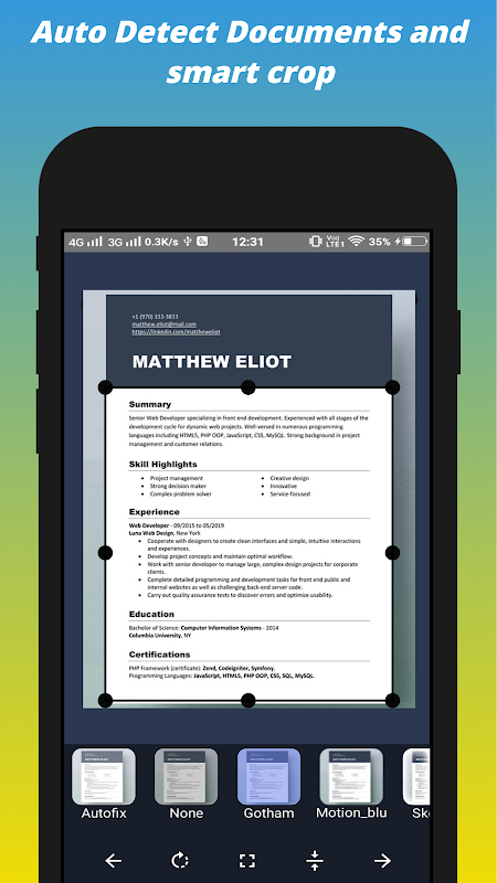 Open Smart Doc Scanner , the best document scanner app in the store, hold it straight against the document you would like to scan. The scanner app will automatically detect the document's edges. You can then crop, edit, rotate and apply filters and export the document as either JPG or PDF with a single tap.