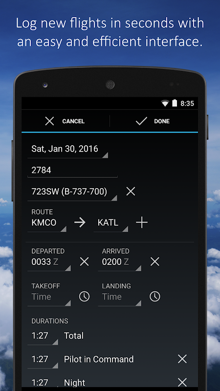 • اندازے کے مطابق رات کے پرواز کے وقت اور ٹیک آف/ لینڈنگ کا خودکار حساب۔