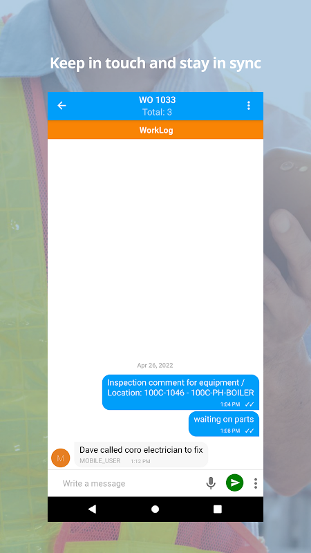 − Have a chat of worklog and capture notes and send messages with voice-to-text functionality