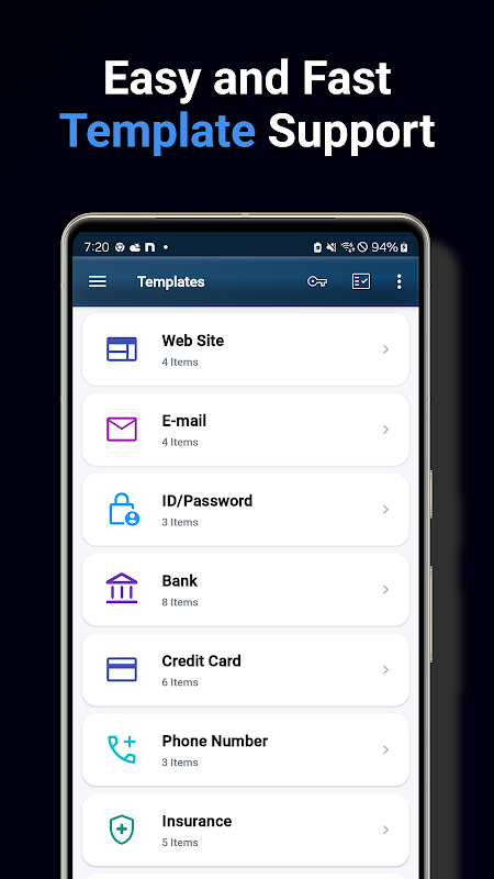 - ٹیمپلیٹ مینجمنٹ: ویب سائٹس، ای میلز، بینکوں، کریڈٹ کارڈز، پاسپورٹ اور انشورنس جیسے مختلف زمروں کا نظم کریں۔