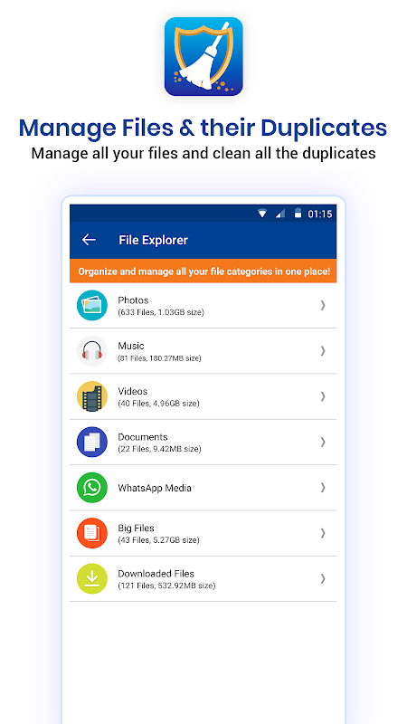 اپنے آلے پر محفوظ کردہ فائلوں کا مؤثر طریقے سے انتظام کرنے کے لیے فائل ایکسپلورر کا بہترین استعمال کریں۔ یہ فائلوں اور فولڈرز کی درجہ بندی کرنے کے لیے سمارٹ فون کلینر کی طرف سے پیش کردہ ایک حیرت انگیز خصوصیت ہے۔ یہ مزید آپ کو اپنی فائلوں کا اشتراک، ہٹانے اور بیک اپ لینے دیتا ہے۔