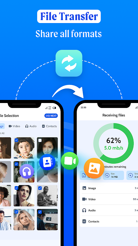 تیز، محفوظ، اور سمارٹ ڈیٹا شیئرنگ کے لیے ڈیزائن کردہ اس آل ان ون سمارٹ موبائل ٹرانسفر ایپ کے ساتھ ڈیٹا کو منتقل کریں، فونز سوئچ کریں اور مواد کو آسانی سے منتقل کریں۔