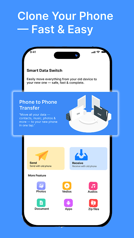 Whether you're changing phones or just need a reliable way to share your content, this powerful phone cloning and data transfer app lets you send files, apps, photos, videos, music, contacts, documents, and more — without limits and without needing Wi-Fi or mobile data!
