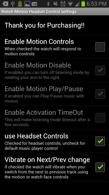 SmartWatch Motion Headset Ctrl gives you the freedom to control your media completely hands free!! Move to the next track with a twist of the wrist. Play and pause your music with a simple gesture! If you have ever wanted to control your music from across the room without having to touch anything then this is the app for you!