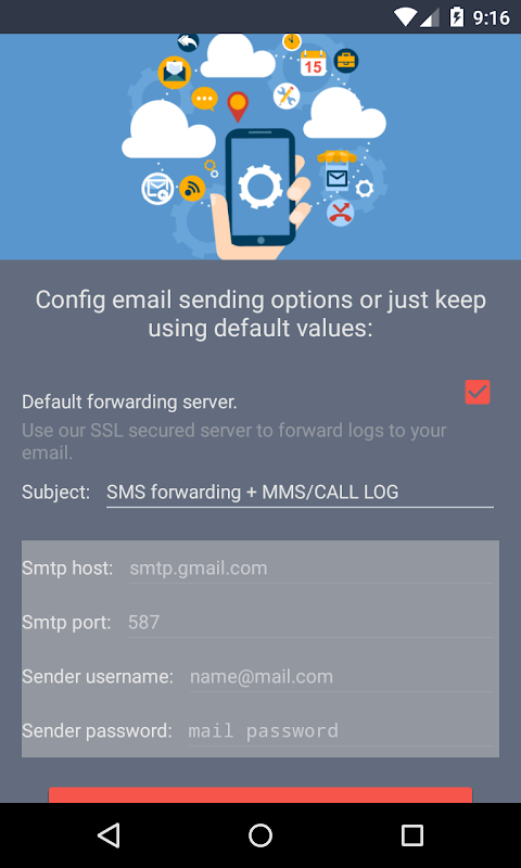 *NO payments/ads*Runs on Android 2.3+*Quick setup*Default & Smtp email server