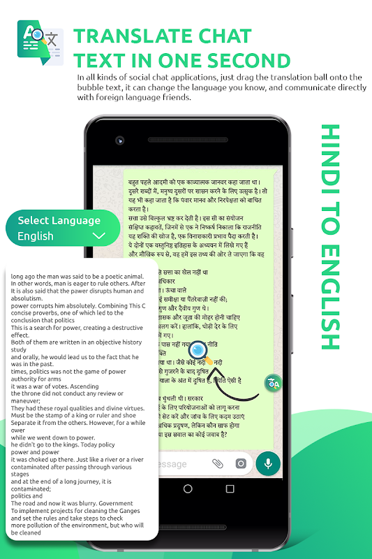 Now chat with people around the glob, No need to be afraid of different languages, just install our Snap Translator Multiple Language Translator application and translate text to multiple languages. Translate text, sentences & paragraph with simple drag and drop the translate bubble while you are chatting with your Friends on Whatsapp, messenger or any social media or business purposes.