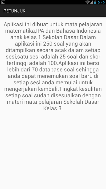 Soal Kelas SD 3 merupakan aplikasi yang berisi latihan soal mata pelajaran Matematika, bahasa Indonesia dan IPA dengan materi pembelajaran untuk Siswa Sekolah Dasar Kelas 3 baik semester 1 maupun semester 2. Dalam aplikasi ini 250 soal yang akan ditampilkan secara acak dalam setiap sesi, satu sesi adalah 25 soal dan skor tertinggi adalah 100. Dengan ini diharapkan siswa mampu terlatih dalam mengerjakan soal matematika, bahasa indonesia dan IPA.