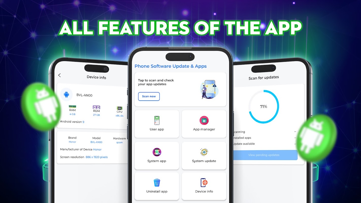 ایپ اپ ڈیٹس کے لیے اسکین کریں، سسٹم ورژن دیکھیں، ڈیوائس کی معلومات، اور ان انسٹال کریں۔