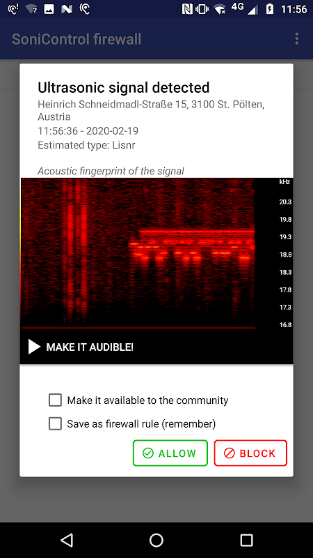 سونیکنٹرول پہلا فائر وال ہے جو الٹراسونک سرگرمی کا پتہ لگاتا ہے ، صارف کو مطلع کرتا ہے اور مطالبہ پر موجود معلومات کو روکتا ہے ، اور اس طرح صارفین کو اپنی رازداری کے تحفظ میں مدد فراہم کرتا ہے۔ مزید برآں ، پتہ لگانے سے متعلق جدید تشخیص فراہم کیے جاتے ہیں۔ سونی کنٹرول الٹراسونک سرگرمی کو بطور اسپیکٹگرام گرام تصور کرتا ہے اور قابل سماعت حد میں ناقابل سماعت آوازوں کو بجانے کا امکان فراہم کرتا ہے۔ مزید برآں ، بہتر جغرافیائی جائزہ کے لئے نقشہ پر فائر وال کے قواعد دکھائے جاتے ہیں۔