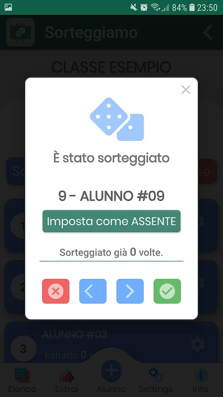 ہر طالب علم کے سوالات کی تعداد محفوظ ہے۔ ہر قرعہ اندازی کے بعد ، اساتذہ سے کہا جاتا ہے کہ وہ قرعہ اندازی کی تصدیق کرے یا کلاس لسٹ میں اگلے یا پچھلے شاگرد کی طرف جائے (جب غیر حاضر طالب علم تیار کیا جاتا ہے تو مفید)۔