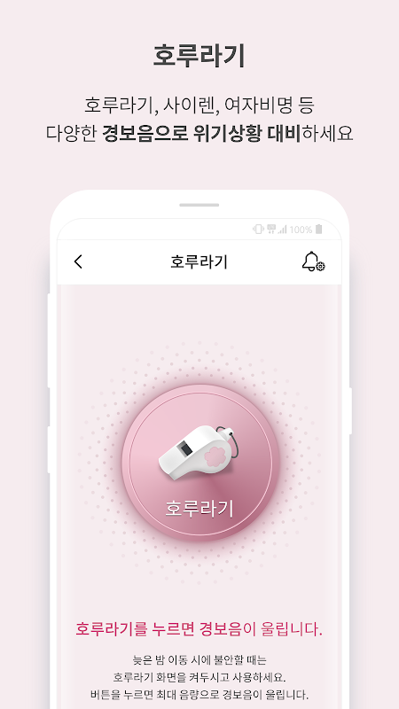 위험 상황에서는 호루라기 경보음 울리기 (호루라기/여자비명/사이렌 소리 설정가능)