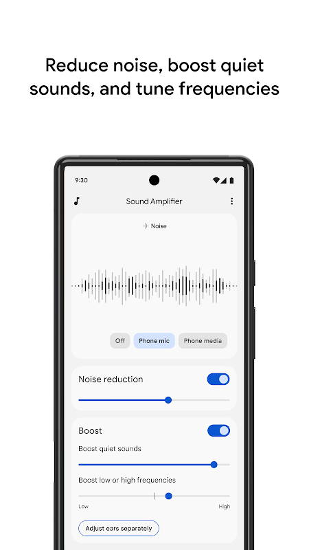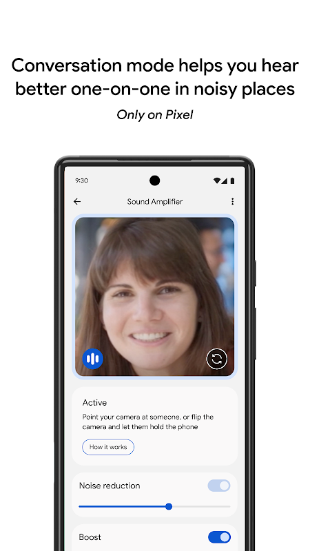 • ایکسیسبیلٹی بٹن، اشارہ، یا فوری سیٹنگز کا استعمال کرتے ہوئے ساؤنڈ ایمپلیفائر کو آن اور آف کریں۔ رسائی کے بٹن، اشارہ اور فوری ترتیبات کے بارے میں مزید جانیں: https://support.google.com/accessibility/android/ answer/7650693