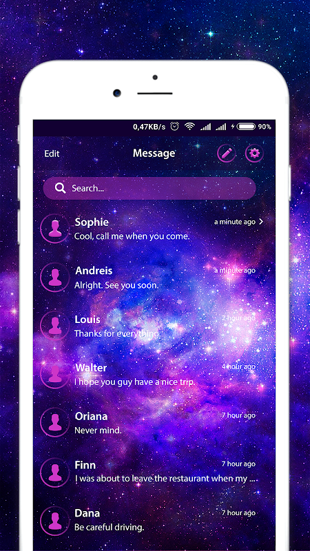 Apply the wonderful galaxy space sms theme and you can get fantastic gorgeous galaxy space sms theme on phone.