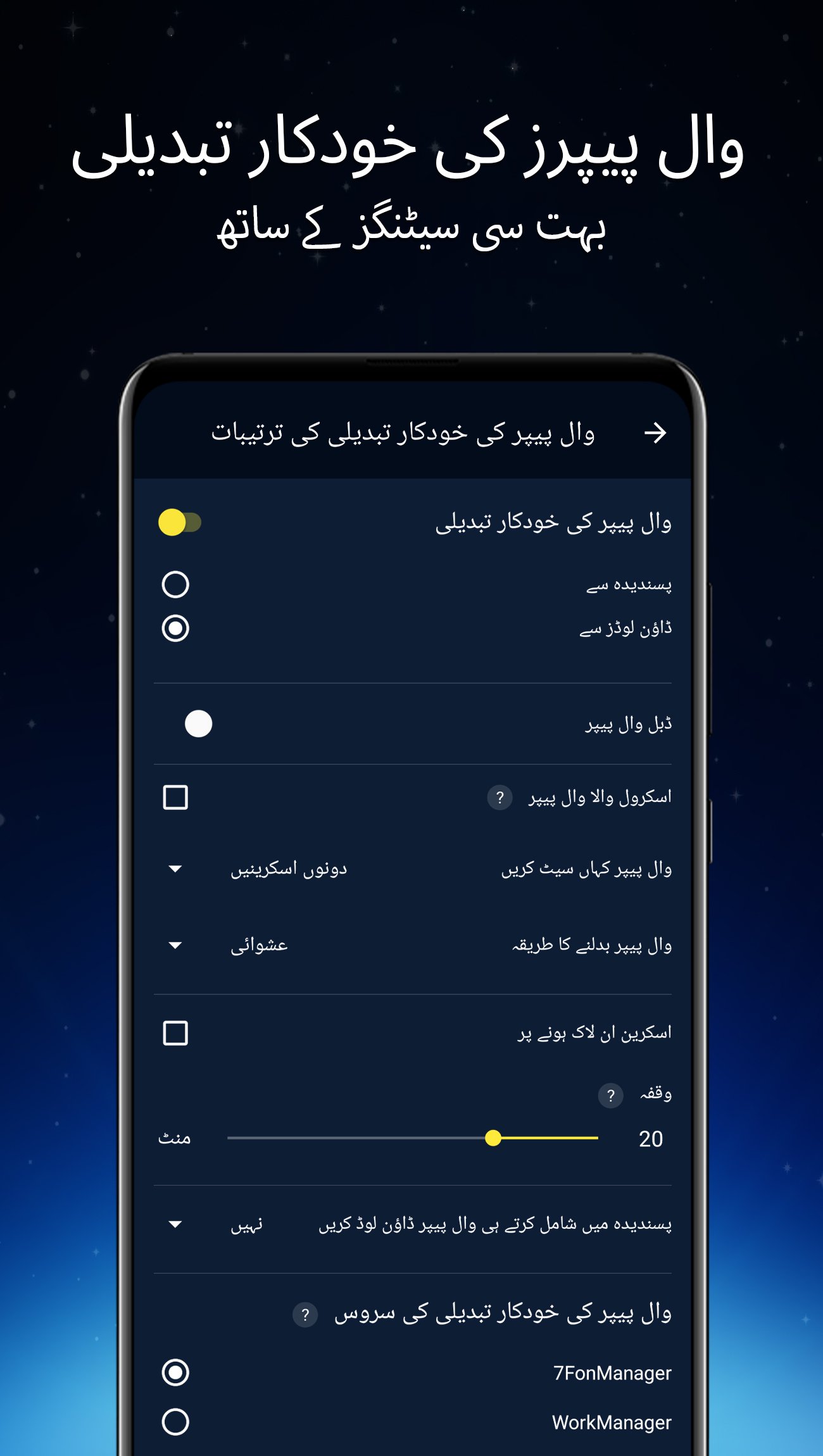 پسندیدہ یا کسی کیٹیگری کو سورس بنائیں، انٹرویل سیٹ کریں — اور وال پیپر خود بخود بدلتے رہیں گے۔ ہوم اور لاک اسکرین کے لیے الگ سیٹنگ بھی کی جا سکتی ہے تاکہ دونوں پر ایک جیسا یا مختلف اسٹائل رہے۔