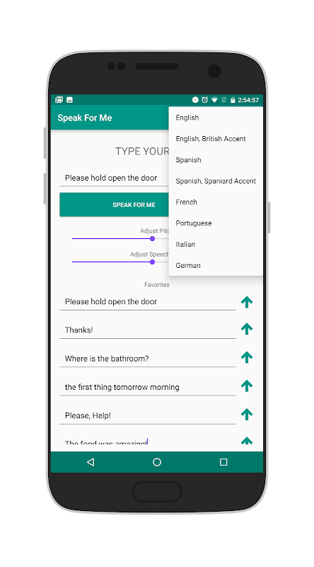 Speak For Me - Text to Speech speaks the words typed onto the text field. Learn how to pronounce words in another language or accent, or If you are mute or have suffered an injury that has impaired your voice, let your voice be heard through Speak For Me - Text to Speech. Speak For Me uses the Text To Speech Engine your phone already has installed, therefore the app cannot change the gender of the voice.