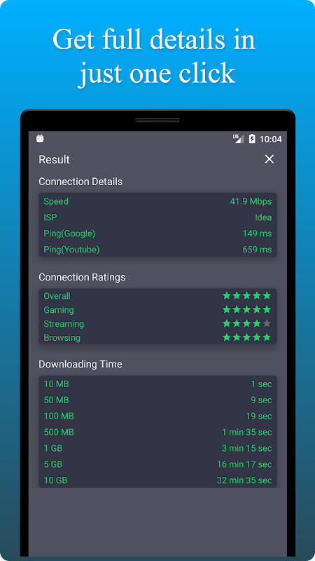 Wifi speed test works so fast, so you can choose which wifi network you should use. Any Wifi speed test will just take 10s. Even work for 3G network. Added Support for 5G network. This speed test Mobile app allows you to easily ping check. After every ping check ,you will get your connection ratings for online games. This speed test mobile app allows you to test your speed without limits. Works with any 5G 4G 3G Wifi(5G, 4G) or broadband network. Fast & Simple UI will give you better experience. Ping check feature is very fast and accurate. Free any network speed test.