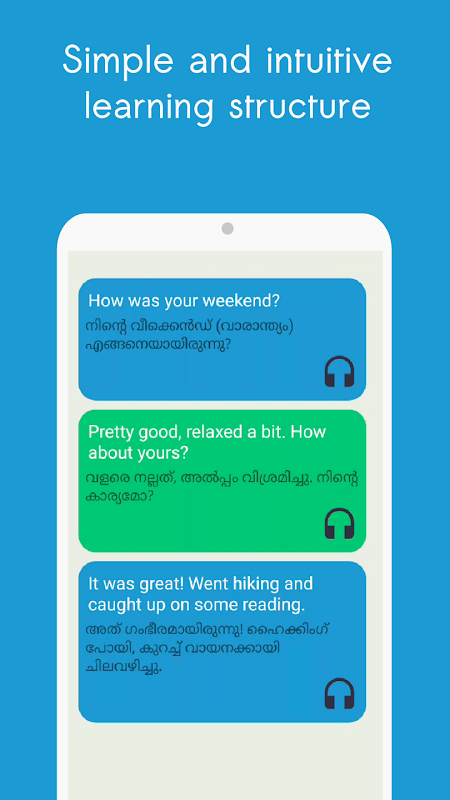 اس ایپ میں مقامی ملیالم بولنے والوں کو فوکس کیا گیا ہے جو اپنے خیالات کے اظہار کے لئے انگریزی بولنا پسند کرتے ہیں۔ ملیالم بولی جانے والی انگریزی ایپ میں مختلف قسم کی خصوصیات شامل ہیں جن میں سیکھنے اور پریکٹس کرنے کا طریقہ بھی شامل ہے۔ اس سے آپ کو انگریزی زبان کے بنیادی ڈھانچے کو سمجھنے میں مدد ملے گی۔ ایپ زبان کی زبان سیکھنے کے لئے باقاعدہ چیزیں لاتا ہے جیسے ٹینسز ، موڈل فعل ، فعل ، اسم وغیرہ۔ اس کے علاوہ آپ کو صوتی انجن کا استعمال کرتے ہوئے جملوں کے صحیح تلفظ کا موقع ملے گا۔ پریکٹس کا طریقہ کار انگریزی کے جملے کا ترجمہ ملیالم زبان میں کرتا ہے۔