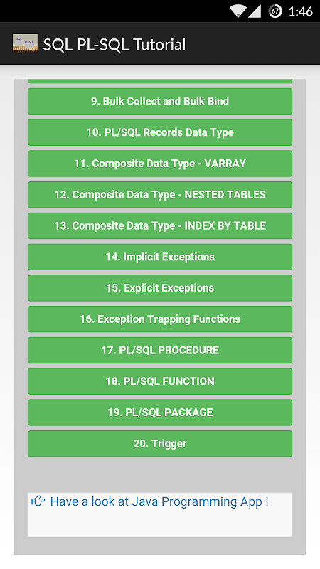 Below is list of SQL and PL-SQL topics covered in the app: