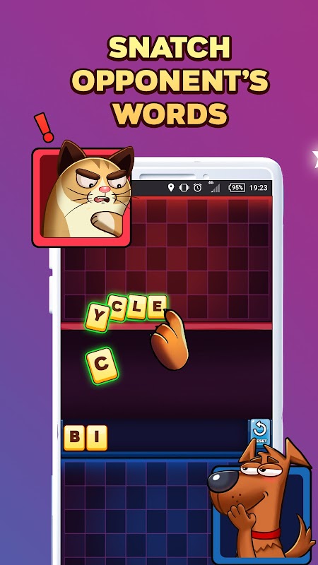 - ریئل ٹائم: ریئل ٹائم میں اپنے حریف کے مقابلے میں ٹرن پر مبنی الفاظ کی بجائے تیزی سے الفاظ بنائیں