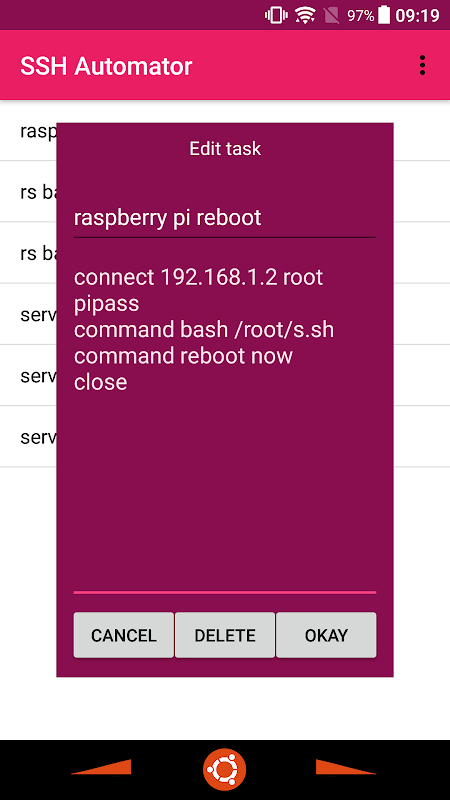 SSH Automator is a tool, which you can program it to do remote task over SSH from your android device. For example; if you have to connect multiple ssh server and run backup tasks every day, you can program that task with SSH Automator and do it with single click. SSH Automator will automaticly connect with your SSH Servers and send the commands one by one. It can connect with unlimited servers in a single task.