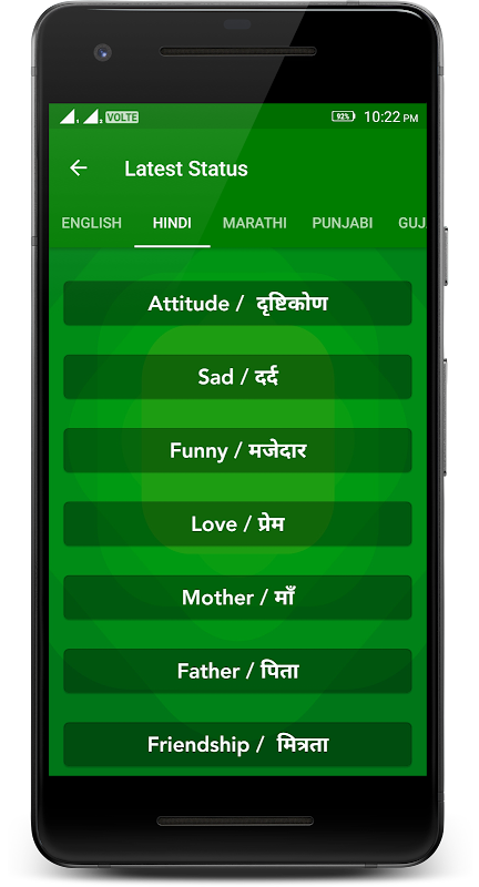 This application contain the status message in different language like Hindi, Gujarati, English, Marathi, Punjabi, Tamil, Telugu, Kannad, Bangali.