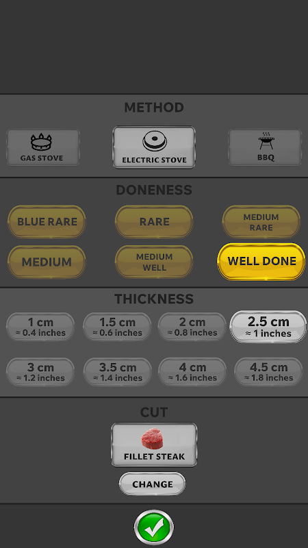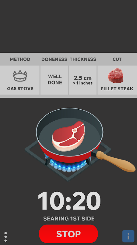 سٹیک ٹائمر ایک سادہ ایپ ہے جو آپ کو کھانا پکانے کے مطلوبہ طریقہ، عطیہ کی سطح، کٹ کی موٹائی اور کٹ کی قسم کے لحاظ سے اپنا گوشت پکانے کا موقع فراہم کرتی ہے۔ آپ کو بس اپنی بیف اسٹیک کی ترتیبات کو اپنی مرضی کے مطابق بنانے اور ٹائمر شروع کرنے کی ضرورت ہے! ایپ آپ کے سٹیک کو درمیان میں پلٹنے کے لیے آڈیو الرٹس کے ذریعے، اور جب یہ ہو جائے گی آپ کو مطلع کرے گی۔ ٹائمر کو کھانا پکانے کے وقت کو کنٹرول کرنے دیں!