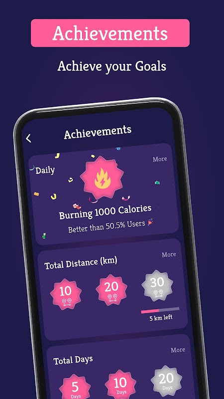 آپ اپنی فٹ سرگرمی (فاصلہ ٹریکر، کیلوریز، دورانیہ وغیرہ) کے لیے اہداف بھی مقرر کر سکتے ہیں۔ روزانہ اقدامات کا مقصد اور قدم چیلنج مقرر کریں۔ مسلسل اپنے مقصد کو حاصل کرنا آپ کو متحرک رکھے گا۔