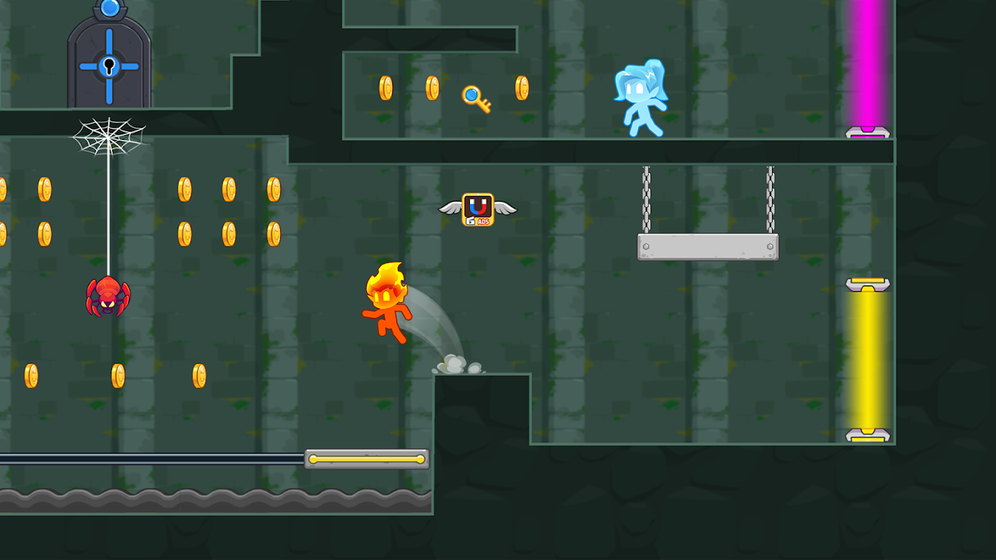 👉 سرخ لڑکے اور نیلی لڑکی کو تیروں سے حرکت دیں اور رکاوٹوں سے بچیں۔ سرخ لڑکے کو پانی سے بچنا چاہیے جبکہ نیلی لڑکی کو آگ سے بچنا چاہیے۔