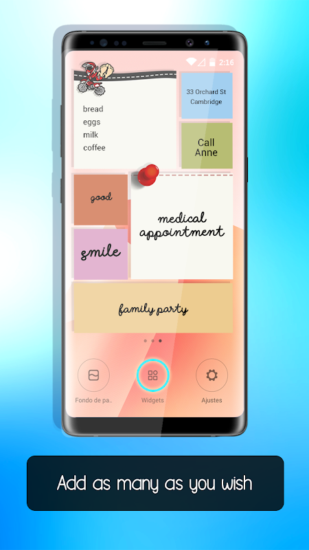 How to use: to put sticky note on your home screen, go to your home screen, tap and hold a free space, and select widget option. Tap the widget on the home screen to open up the edit screen.