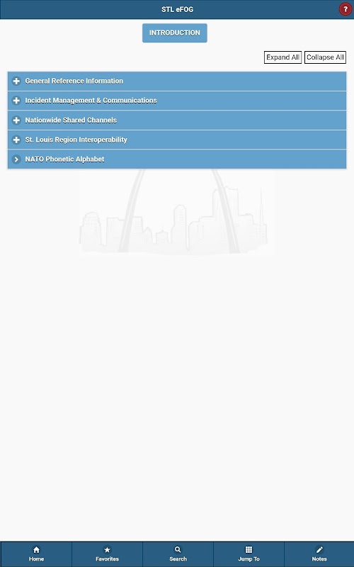 STL eFOG موبائل ایپ صارفین کو پبلک سیفٹی کمیونیکیشنز کی معلومات تک آسان رسائی فراہم کرتی ہے، جس میں حوالہ جات، ٹیبلز، اعداد و شمار یا تصاویر پر فوری چھلانگ لگانے کے لیے لنکس کے ساتھ مواد کا اشاریہ پیش کیا جاتا ہے۔ پسندیدہ کو محفوظ کرنے اور ان لائن نوٹس بنانے کی صلاحیت اہم معلومات تک ذاتی رسائی کو قابل بناتی ہے۔ STL eFOG کو ڈاؤن لوڈ کیا جا سکتا ہے اور پھر اسے آف لائن حوالہ کے طور پر فیلڈ میں لے جایا جا سکتا ہے، اسے انٹرنیٹ کنکشن کی ضرورت کے بغیر استعمال کیا جا سکتا ہے۔
