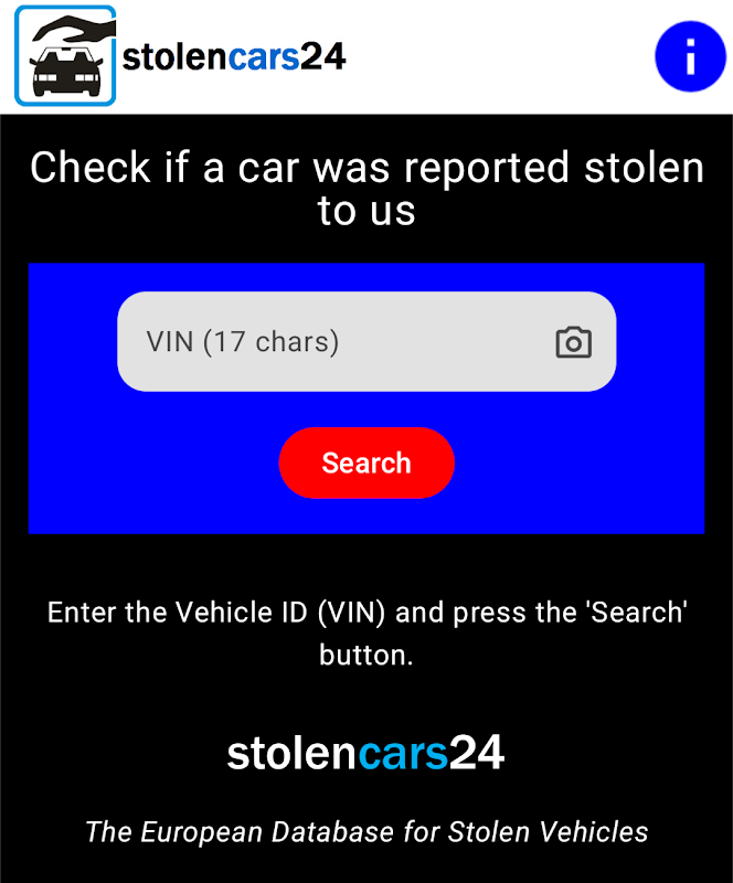 Stolencars24 چوری کے لیے چیسس نمبر (VIN) چیک کرنے کے لیے شاید سب سے بڑا یورپی آن لائن ڈیٹا بیس ہے۔