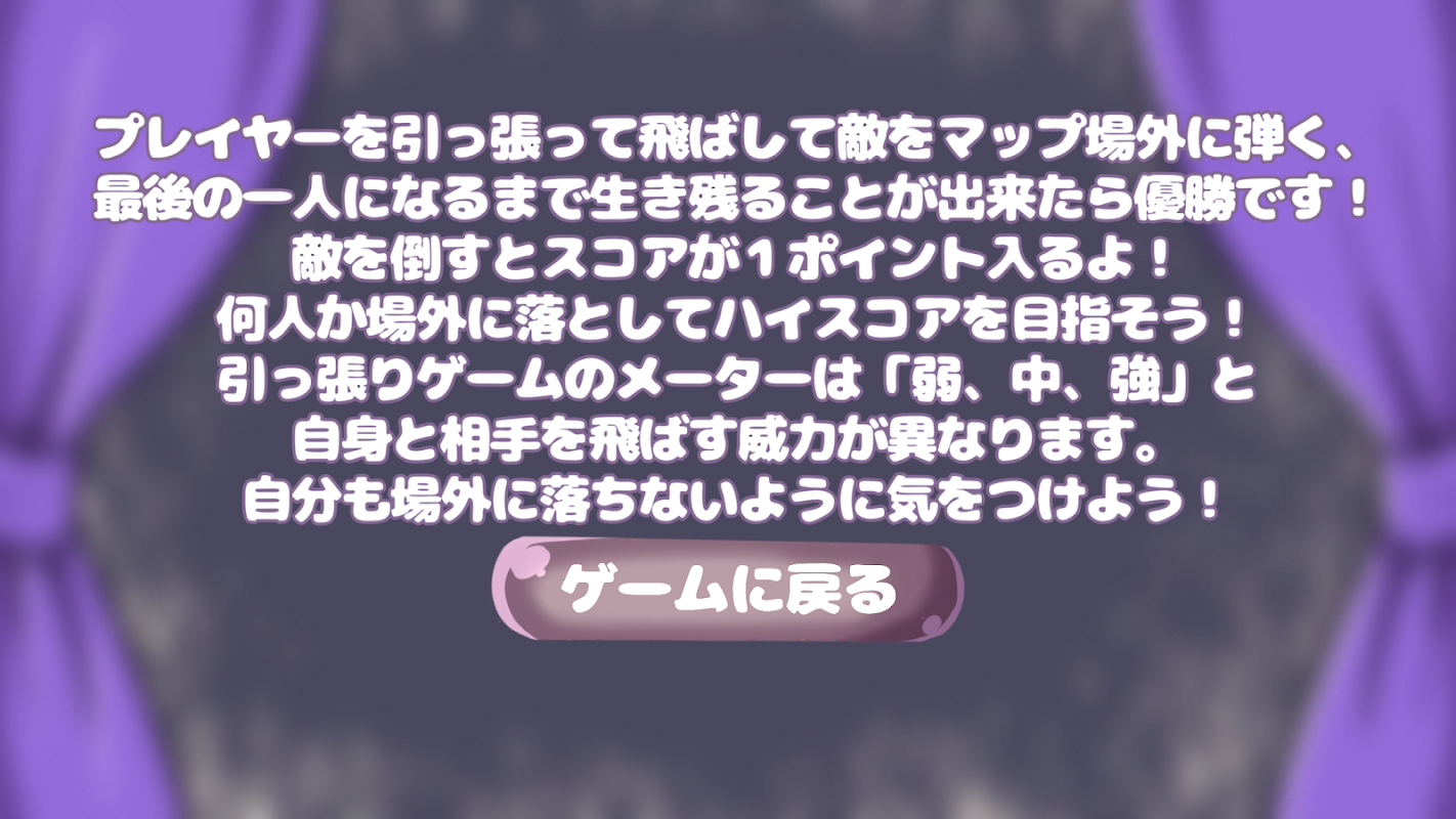 ایک سادہ کھیل جہاں آپ کھلاڑی کو کھینچتے ہیں اور دشمنوں کو علاقے سے اچھالنے کے لیے اُڑتے ہوئے بھیجتے ہیں اور آخری کھڑے ہونے کا مقصد رکھتے ہیں!