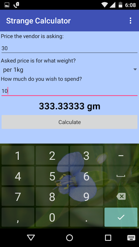Suppose, a shopkeeper is selling a vegetable at Rs. 30 per kg. And I wish to spend only Rs. 10. In such a situation it becomes difficult for me to calculate how much vegetable will I get for Rs. 10. This is where this app comes in handy. You just need to put the price "30" in the first textbox and select "per 1kg" from the drop down, and lastly enter "10" for the amount you wish to pay in the next textbox. The app calculates how many gms of vegetables will u get for Rs. 10 as soon as u tap the "Calculate" button.