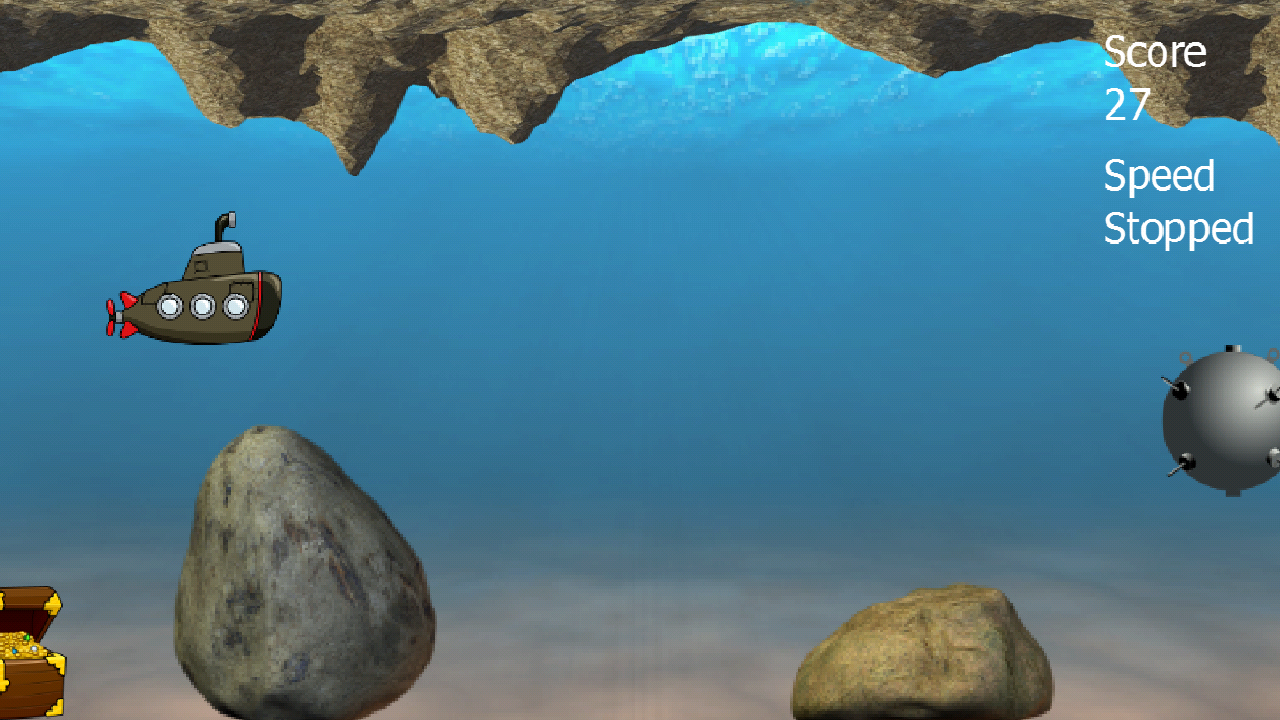 Navigate a submarine through an underwater cave, collecting treasure while avoiding rocks, mines and torpedoes.