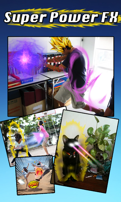Modify your photos, add super photo effects and stickers, superpower effects (kamehameha, beam cannon, laser, rasengan) , face booth (masks, glasses), troll face (meme maker), cartoon camera, tatoo, weapons, wings and insta photo filters.