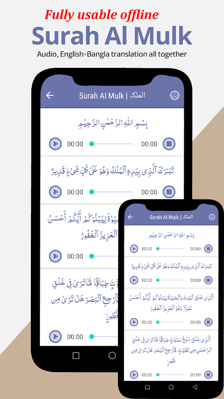ہم سورۃ الملک ایپ کو صارف دوست بناتے ہیں تاکہ ان صارفین کی مدد کی جاسکے جو سورہ کو سمجھنا یا سننا چاہتے ہیں۔ ہم نے سورہ کے عربی متن کے ساتھ ساتھ انگریزی اور بنگالی میں ترجمہ بھی شامل کیا۔