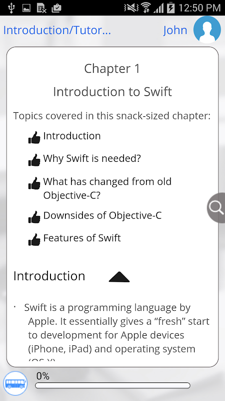 You have limited access to the content provided. For full access to the content, please login and purchase this application. This app provides a quick summary of essential concepts in Swift, Java and Computer Science by following snack sized chapters: