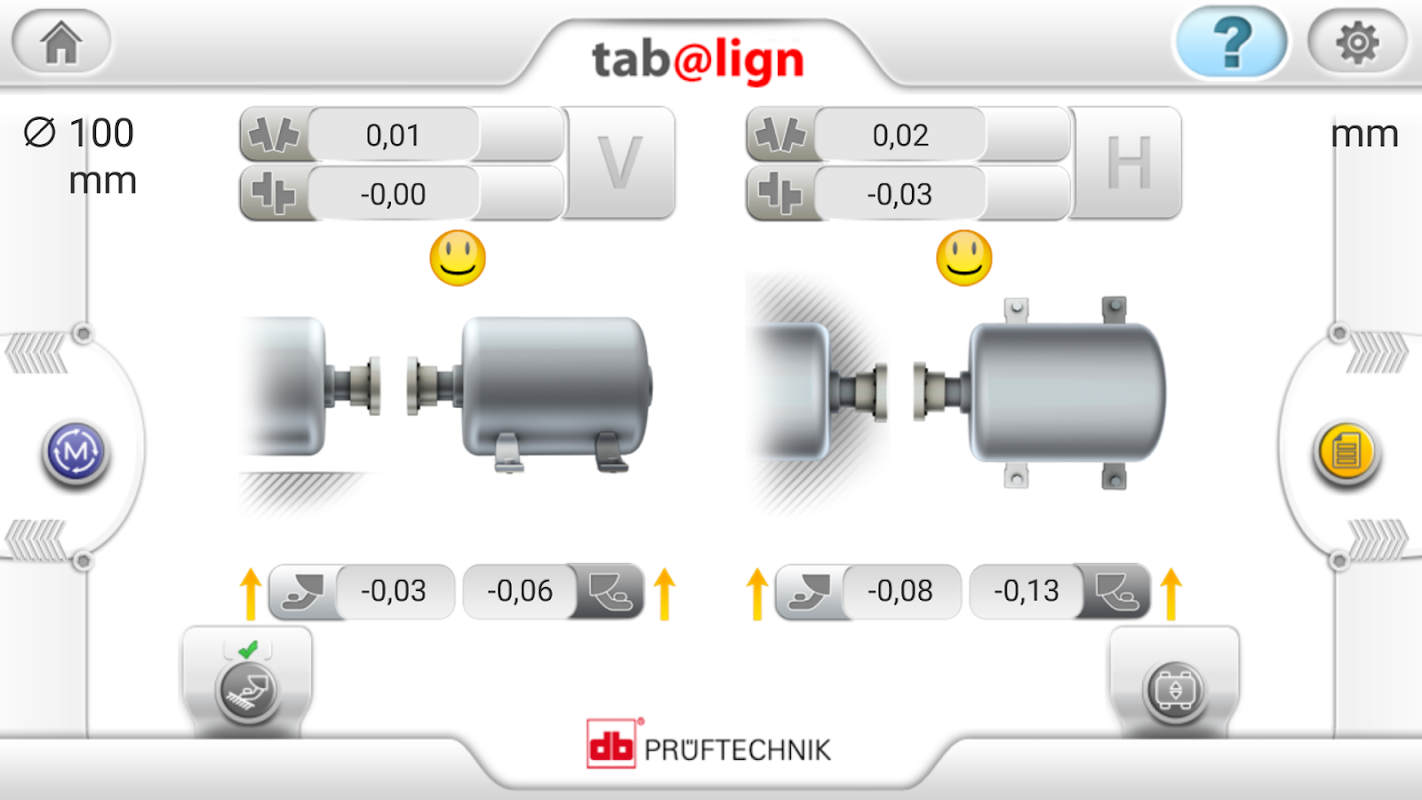 Both horizontal and vertical coupling and foot results are automatically calculated and displayed. The graphics show the machine position and the arrows the necessary feet corrections. During Live Move, tab@lign monitors the horizontal changes live on the screen, continuously updating the adjustments.