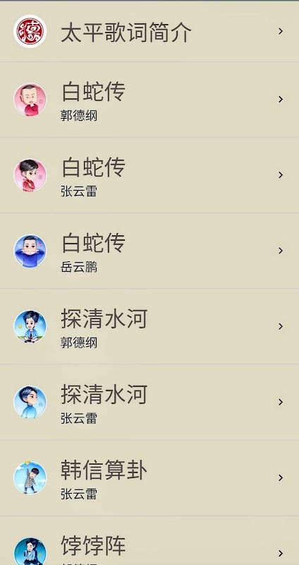 تائپنگکی مجموعہ (太平 歌词) 一种 一种 从属于 相声 的 曲艺 形式 形式 约 形成 清代 清代 初 叶 , , 从 的 民间 小曲 演变 而来 , 一直 一直 被 作为 的 四 门 门 基本功 之一 , 德 云 火爆 进一步 进一步 推动太平 歌词 的 发展。 除此之外 应 用户 要求 , 还有 一些 其他 的 传统 曲艺