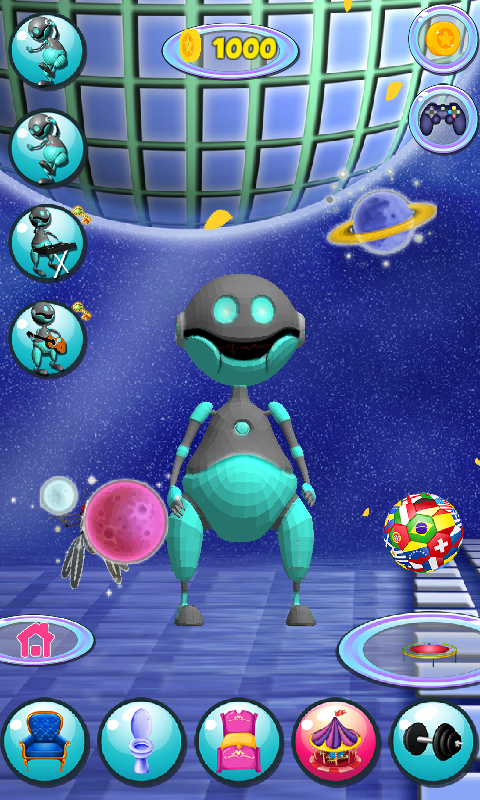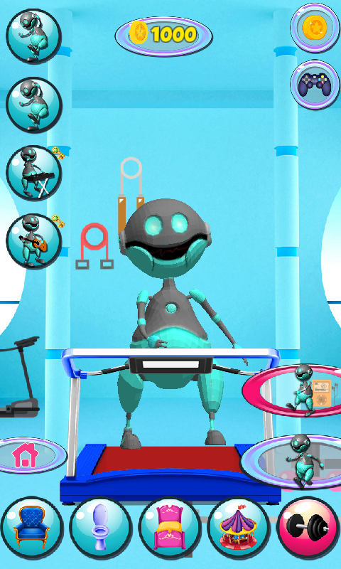 You have an option to take your pal to the loo, and help him do all the bathroom stuff, but teeth isn’t really his thing. He prefers having long showers. No matter the fact that he is a machine, a good night sleep is also necessary for him, too. Turn off the light by tapping on the smartphone icon, and he will be snoring within a few seconds. For the cool talking robot, the playground is in the outer space. He adores jumping on the trampoline or playing with his ball. Tap on the fly next to him an it will go all over the place. Don’t miss this awesome opportunity to obtain one of the most popular games, the latest Talking Robot. He even has his own gym, since staying fit is very important for your friend. Choose the speed for the treadmill for him, or make him walk slowly. Exercising has become a part of his life.